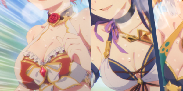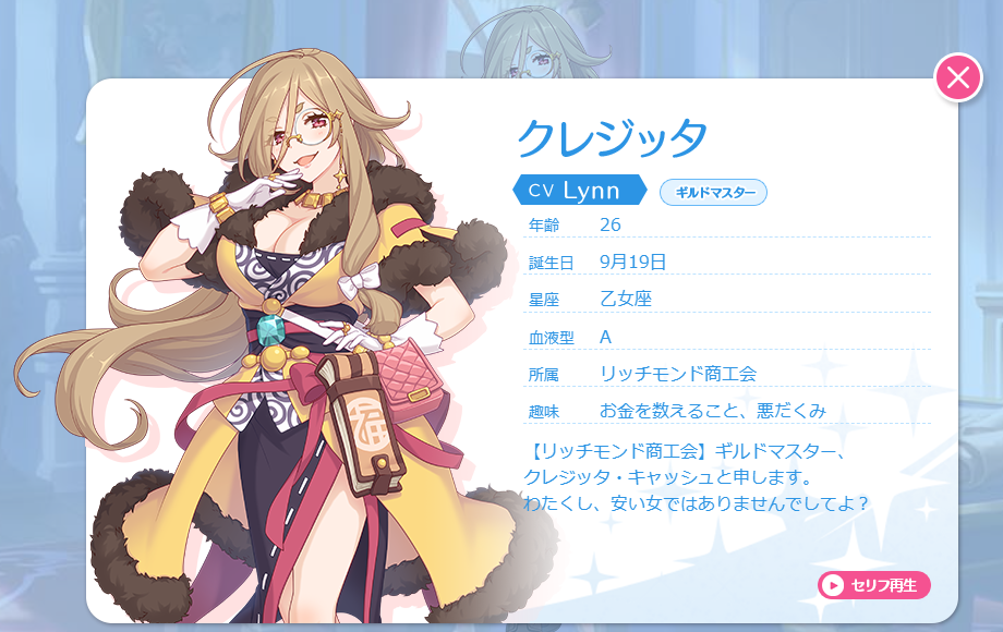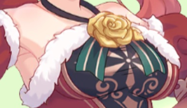 ペコリーヌが横に並んでもあちらが普通サイズに見えてしまう程、プリコネの女性陣の中で屈指の爆乳の持ち主。キャラクターストーリー第1話より、シェフィ『(ぺこの)むね、おっきぃー!』→クレジッタ『わたくしのほうがおおきいですわよーっ!!!(怒)』