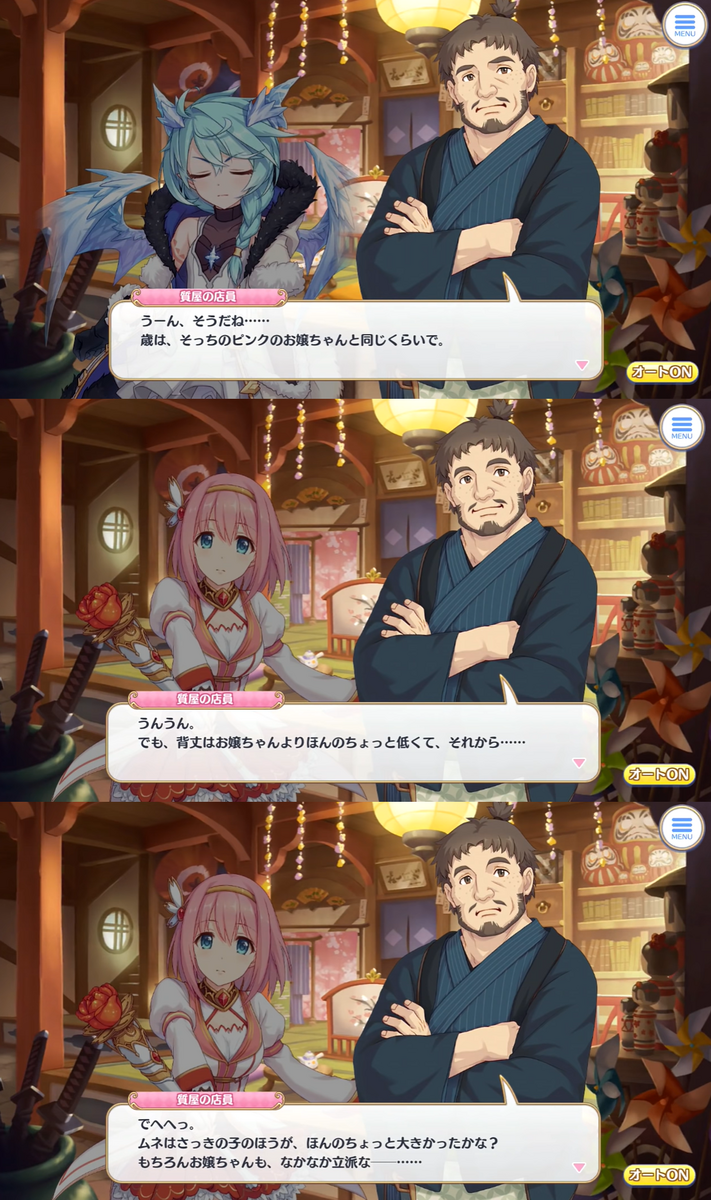 立ち絵のサイズ比を考慮するとペコリーヌはGカップ、ユイはペコよりも小さいのでF。カオリ、イオ、ミサト等はHカップ、ネアがIカップ、そしてクレジッタがJ(最胸)。